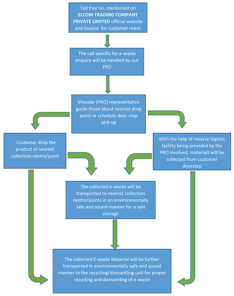 As an environmentally responsible corporate organization we hereby ensure environmentally safe and sound management of e-waste and for the same we have partnered with M/s Vincular Testing Labs India Private Limited a Producer Responsibility Organization (PRO) who will support us in the channelization of e-waste from end customer to the recycling/dismantling premise, establishment of collection centres and running buy-back scheme as an when required. As a support, we will ensure to mention the toll-free no. in the invoice and our official website. Bluedart Express Limited is the e-waste managing partner of our PRO for reverse logistics facility will facilitate collection of e-waste from the collection centre/point and also support with door to door collection of e-waste in environmentally safe and sound manner. As a part of the execution plan, any consumer who wish to handover the old product can reach out to the toll-free no. 1800 1020 527. Our PRO shall make the necessary proceedings as per the enquiry/request received and accordingly shall update ELCOM TRADING COMPANY PRIVATE LIMITED team to carry the request forwards accordingly.